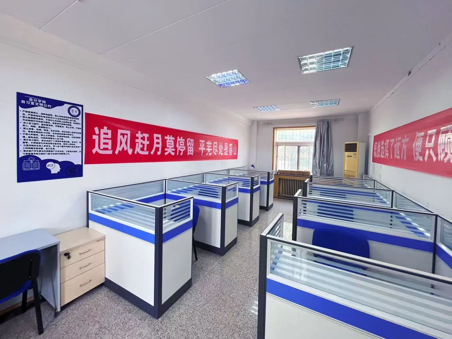 学期初,公司面对办公用房紧张的实际困难,坚持从5号楼腾出201和210两间办公室规划为考研自习室。在公司各职能部门支持下,公司调配资源、优化布局,历时三个月将办公室改造成考研自习室。走进这里,明亮的灯光洒满每一个角落,崭新的桌椅整齐排列,每张座位旁都配备了专属存包柜,方便同学们存放复习资料和个人物品;墙上还贴心张贴了作息时间表和励志标语,处处彰显着公司对员工成长成才的殷切期望与悉心爱护。自习室每日7:00至22:00全程开放,充足的时间和空间保障让同学们能专注投入复习。这不仅是一间自习室,更是公司为学子们搭建的“备考加油站”,藏着对大家金榜题名的满满期待。